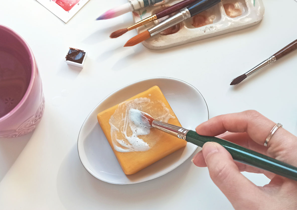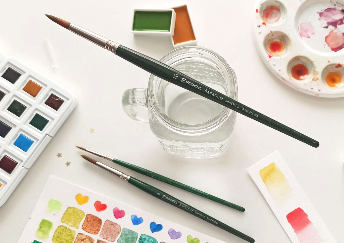 Después de cada sesión, es suficiente con enjuagar bien los pinceles en agua limpia. Pero de vez en cuando, limpia con jabón para una limpieza más profunda. También debes limpiar la paleta cuando esté muy manchada.